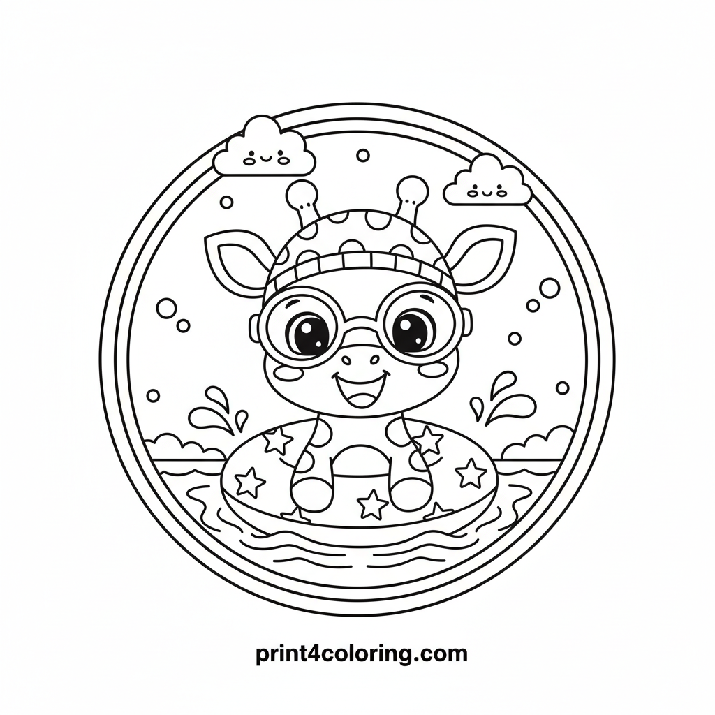 Dive into fun with our silly giraffe, ready for a splash! Wearing oversized goggles and a bright swim cap, this friendly giant is hilariously learning to swim in a shallow pool with a floatie. He looks a little surprised but is clearly having a wonderfully happy time. Add vibrant colors to his adorable aquatic adventure!