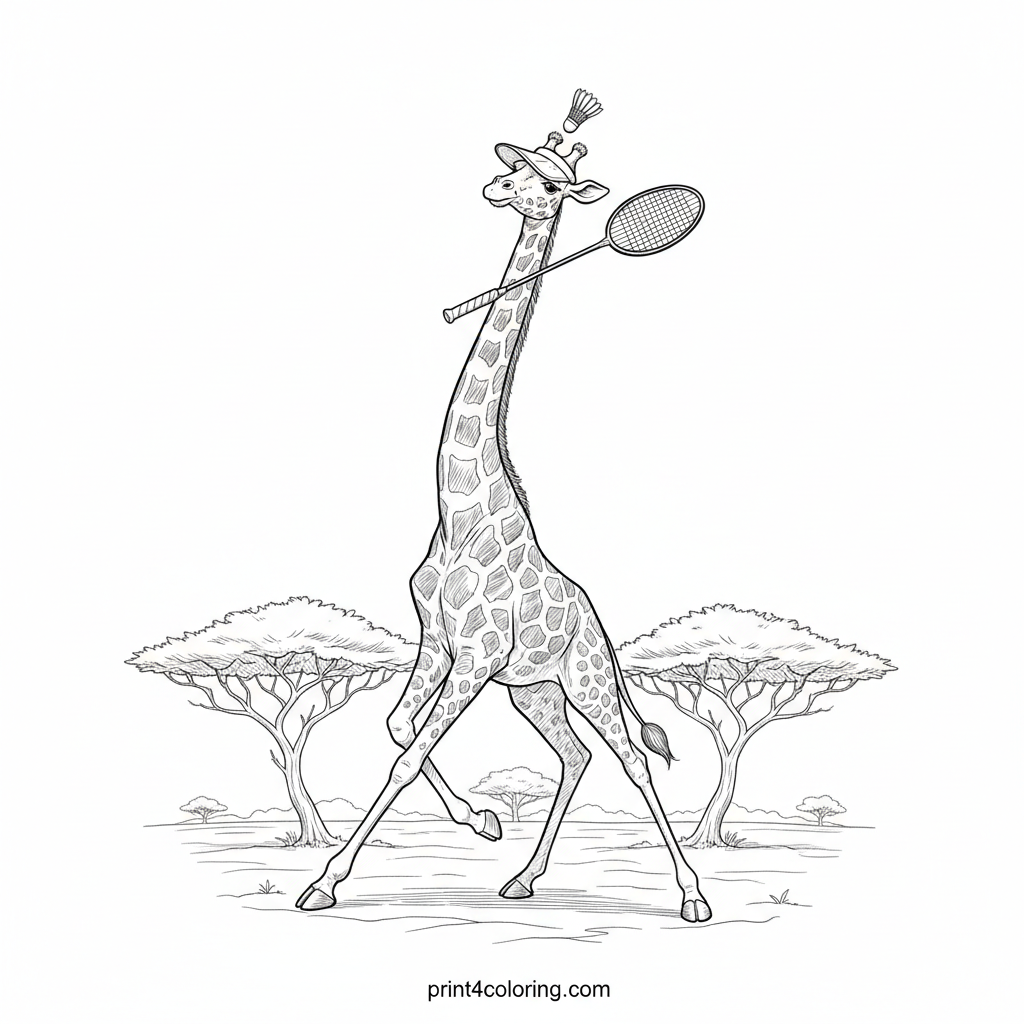 Get ready for some savanna sports action! This expert-level coloring page features a towering giraffe in a slightly crooked visor, focused on a very careful badminton serve. Look closely for the funny shuttlecock perched on its head, all set against a beautiful, detailed savanna background with iconic acacia trees.