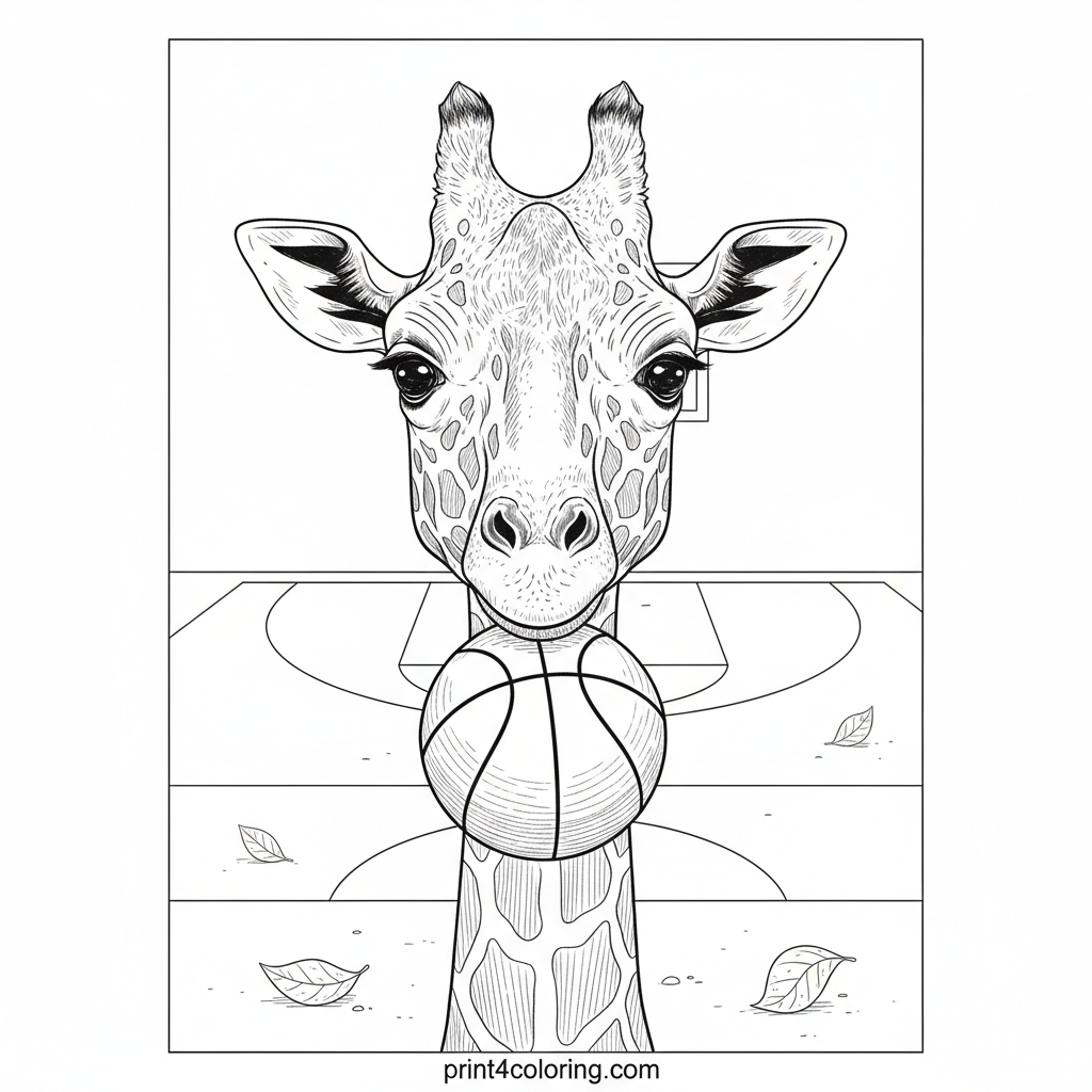 Witness a truly unique game! A magnificent giraffe, with detailed spots and a long neck, comically attempts to dribble a basketball with its nose on an outdoor court. Its gentle, bewildered expression adds to the fun. Color the meticulous court lines, a distant hoop, and scattered leaves, blending wildlife with a playful twist.