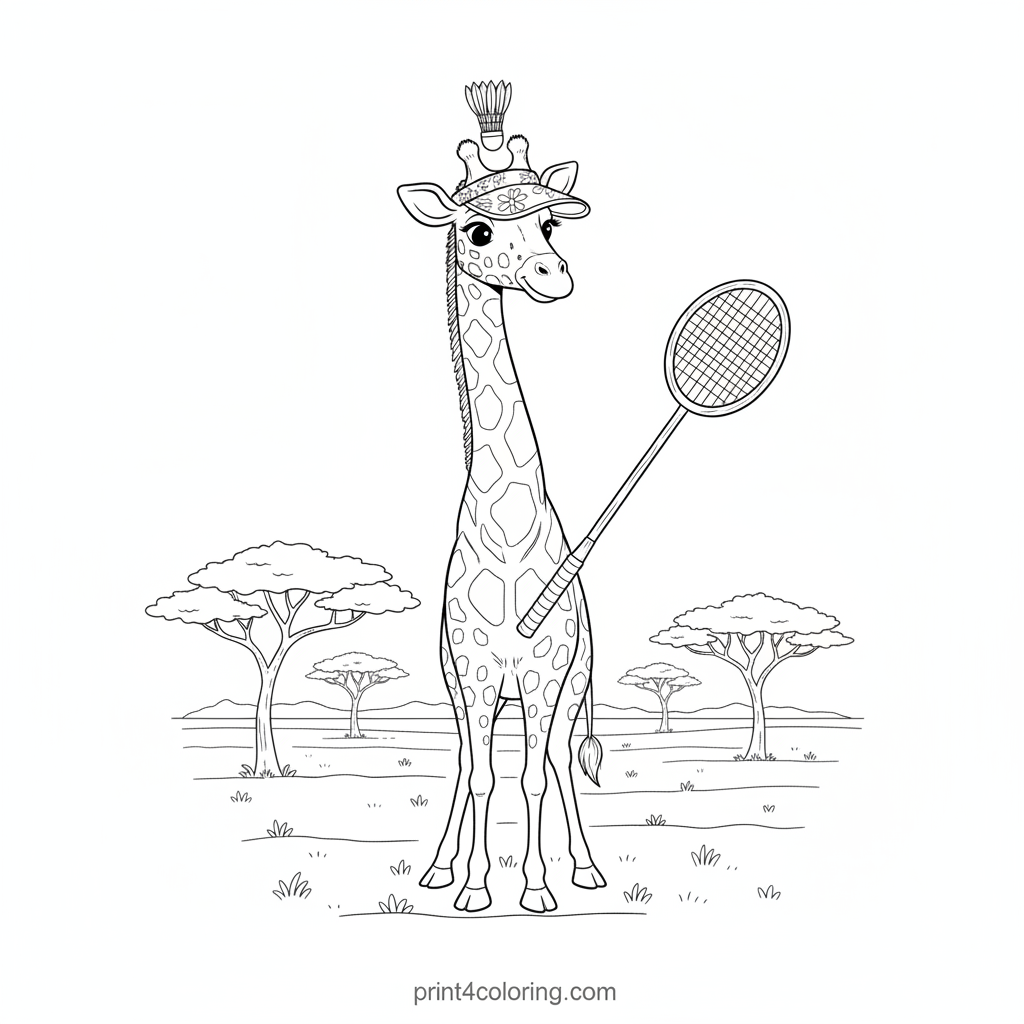 Giraffe's Grand Badminton Gambit: A Playful Serve Coloring Page