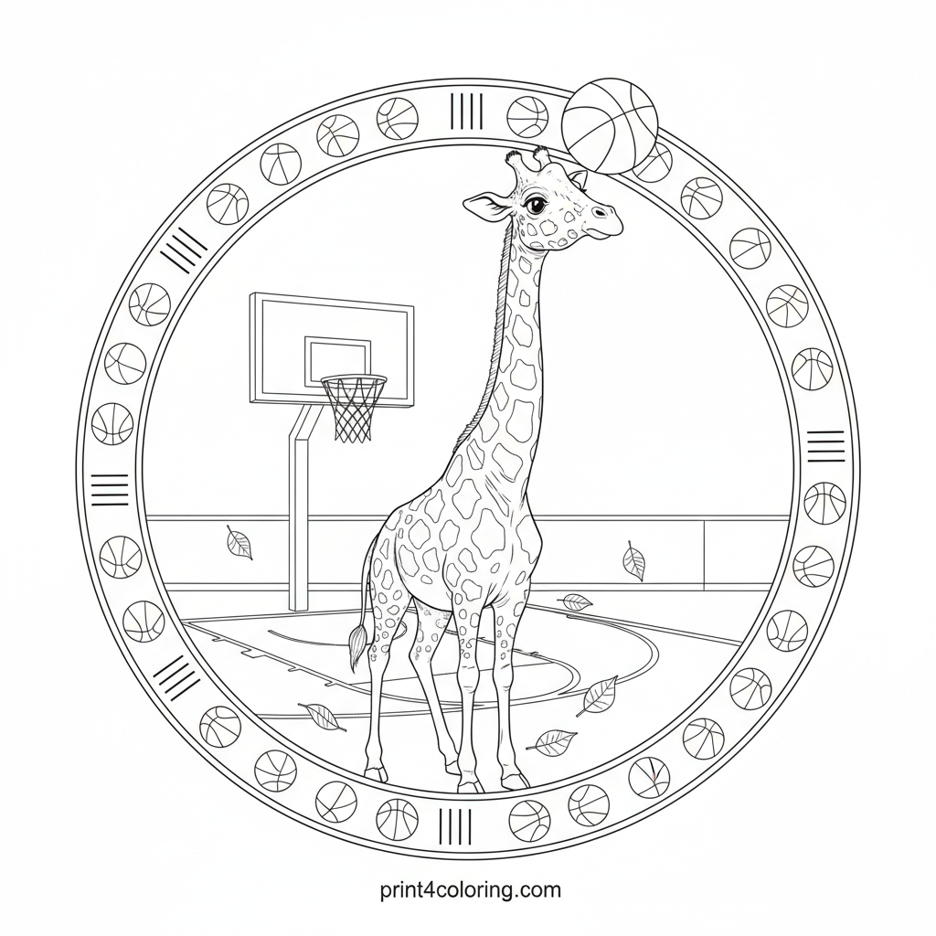 Imagine a gentle giraffe with a long neck and detailed spots trying to dribble a basketball with its nose on an outdoor court! This expert-level page features intricate court lines, a distant hoop, and scattered leaves. It's a whimsical blend of wildlife and sport, perfect for creative colorists.