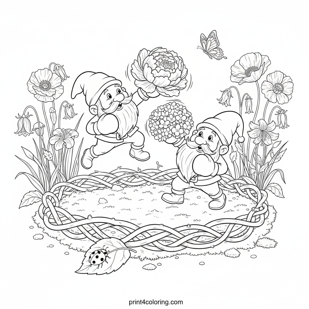 Get ready for a whimsical 'petal punch-out'! Two cheerful garden gnomes playfully spar with soft flower blossoms in a miniature ring of intertwined vines and moss. Surround them with vibrant garden flowers and tiny, realistic insects, bringing this charming scene to life!