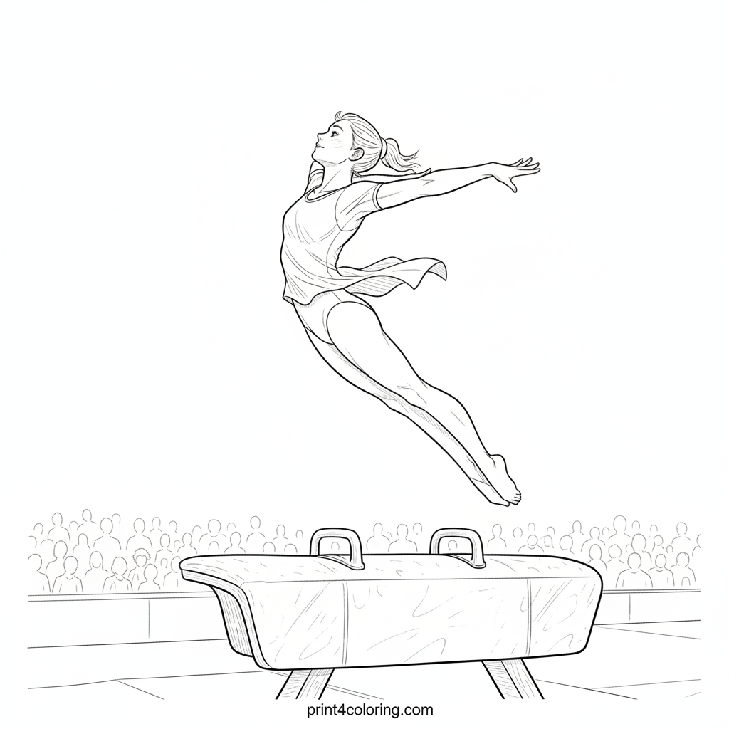 Capture the thrilling moment a talented gymnast soars high above the vaulting horse! Their body forms a beautiful arch, arms reaching out in a powerful, elegant pose. This dynamic scene invites you to add vibrant colors to their leotard, bring the textured vault to life, and show the incredible strength and artistry of gymnastics.