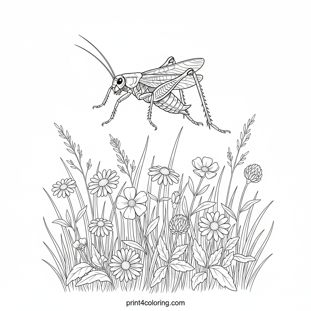 Witness a powerful cricket soaring mid-air, hind legs extended for a magnificent jump! This detailed scene captures the insect's intricate body and delicate wings gracefully leaping over vibrant wildflowers and tall grass. It’s a dynamic natural moment, ready for your creative colors.