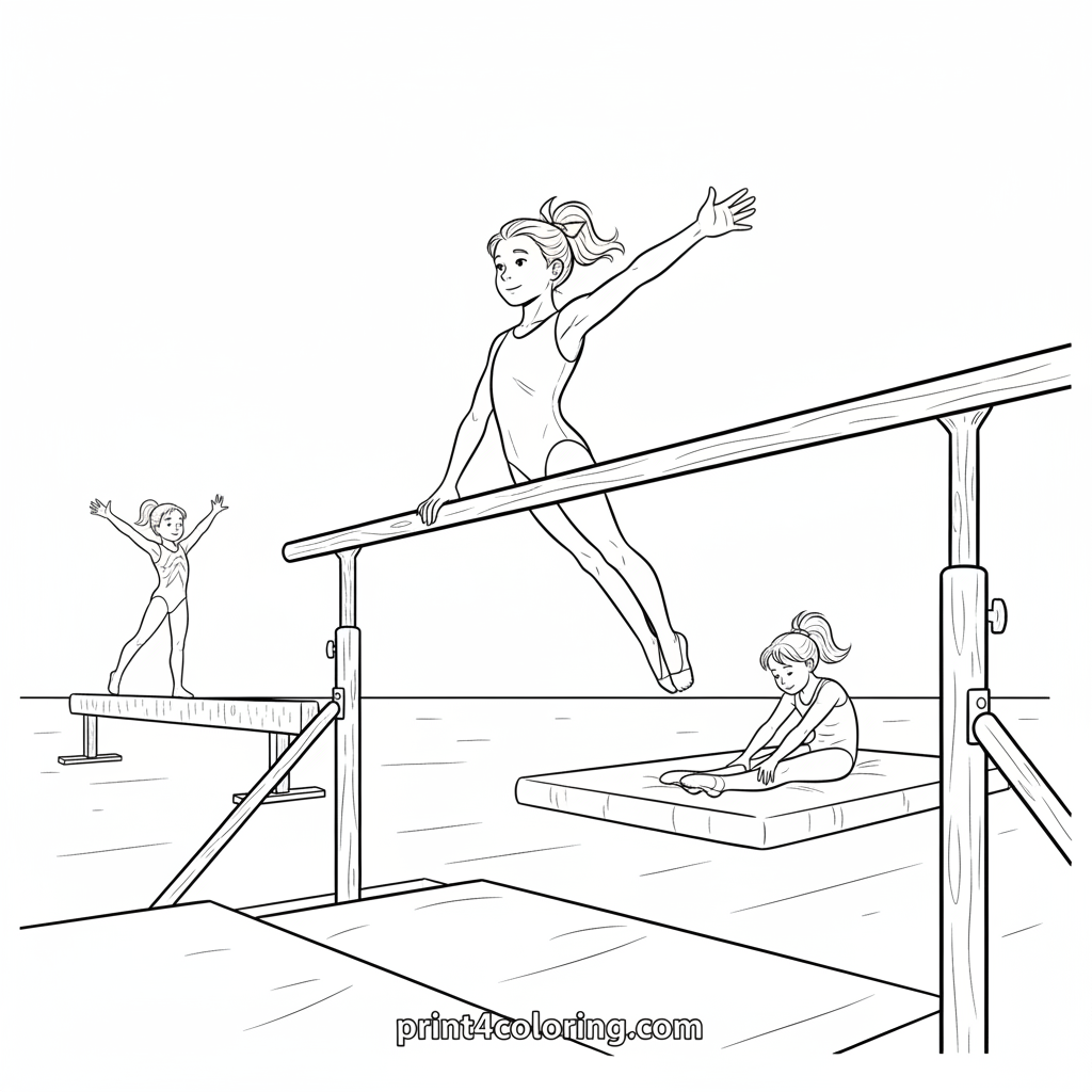 Step into a vibrant gymnastics club bustling with activity! Young gymnasts perfect their skills: one focused on the balance beam, another stretching with elegance, and a third soaring gently on the uneven bars. This detailed scene captures the dedication and joy of practice, inviting you to add a splash of color to their dynamic world.