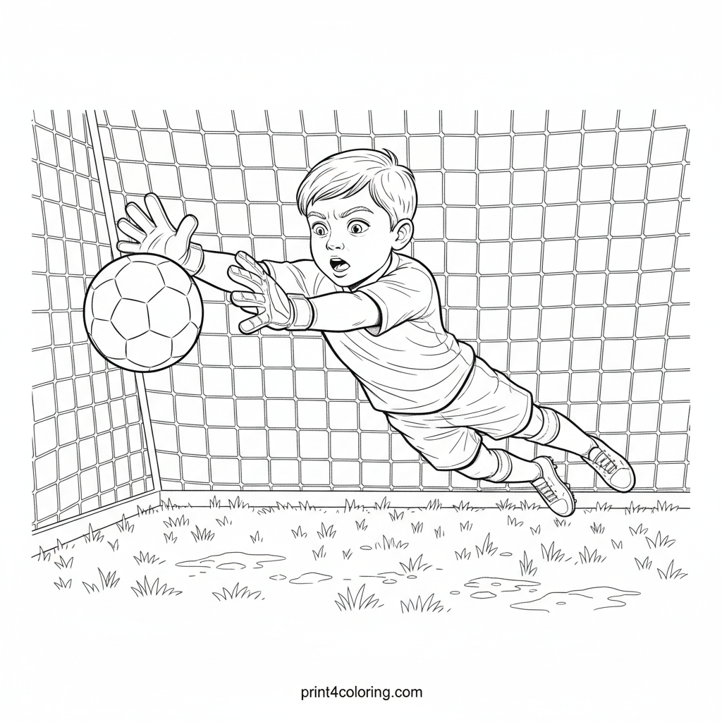 Dive into the heart-pounding action of a championship game! This detailed scene captures a determined young goalie mid-air, making an incredible save. The soccer ball is inches away from their outstretched hands, with the net and a finely rendered grassy field in the background. A perfect page for aspiring athletes and sports fans!