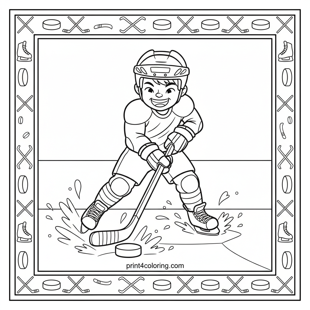 Get ready for action with this thrilling hockey scene! A young player glides across the ice, powerfully winding up for a super shot. Watch the ice shavings fly as they aim for the goal with fierce determination. Grab your crayons and bring this dynamic moment to life with vibrant colors!