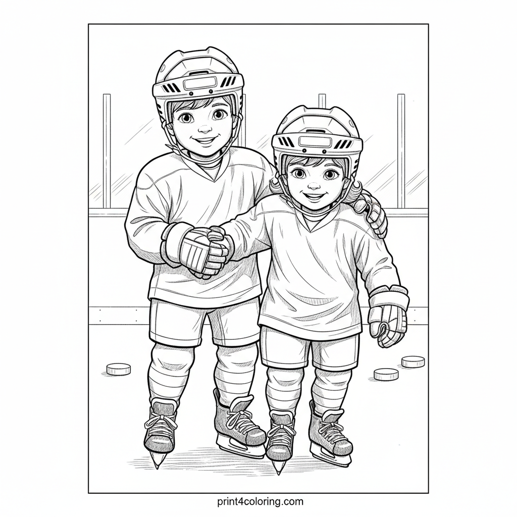 Skate onto the ice with two friendly hockey players! One experienced buddy gently guides a friend learning to balance, both smiling in their detailed uniforms. Scattered pucks and rink boards add to this heartwarming scene of teamwork and friendship, perfect for an expert coloring challenge.
