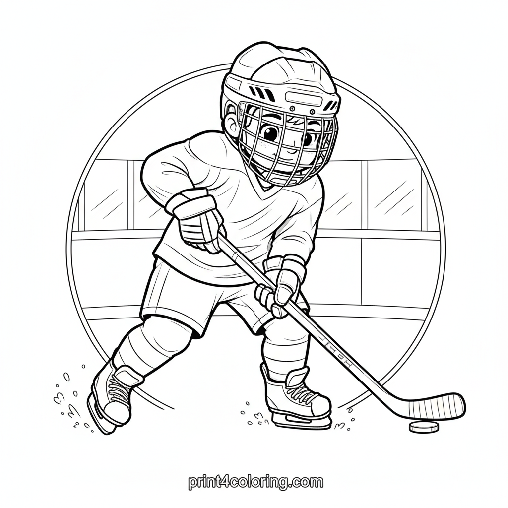 Get ready to color an exciting moment on the ice! A determined young hockey player, fully geared up, is captured mid-stride, stick poised for a powerful slapshot. Ice chips fly dramatically as they speed across the rink, ready to score. Bring this action-packed scene to life with your favorite colors!