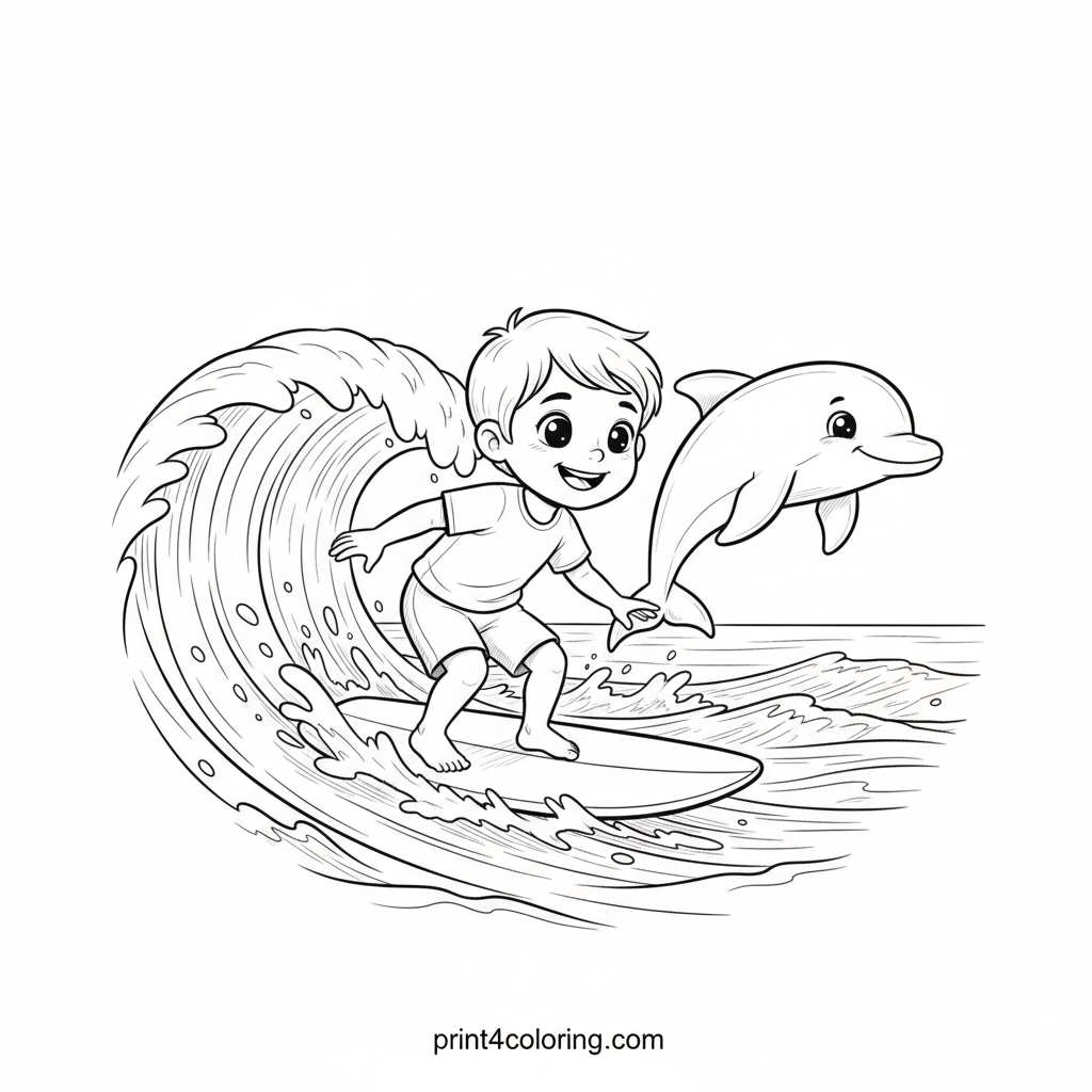 Dive into a delightful ocean scene where a happy child glides effortlessly on a surfboard! A sleek, friendly dolphin leaps high beside them, splashing playfully as if inviting a race. Explore the intricate details of the ocean waves and the vast horizon in this heartwarming adventure. Perfect for coloring fun!