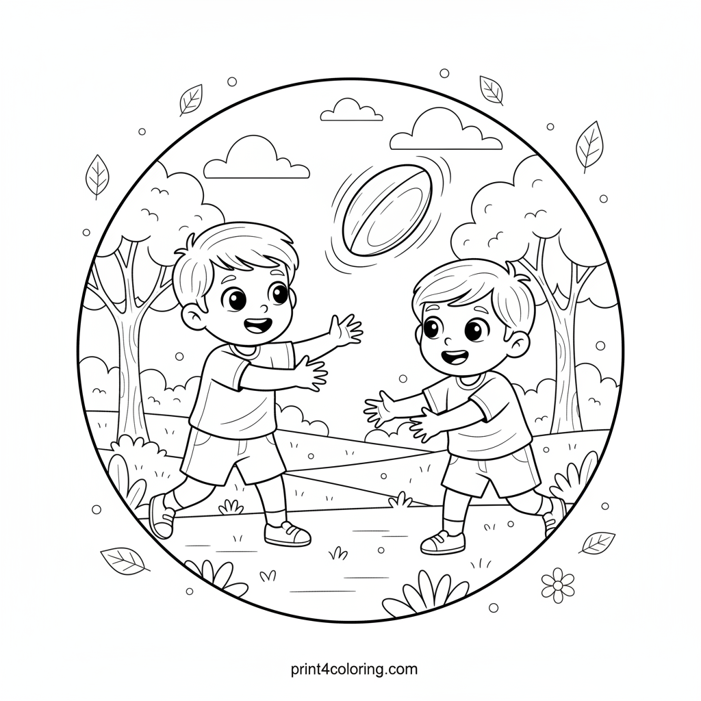 Experience the joy of friendship and outdoor play! Two happy children are in a vibrant park, one mid-throw with a textured rugby ball, the other ready to catch. Lush green grass, detailed trees, and a bright sky create a perfect backdrop for this cooperative and heartwarming scene. Bring this fun moment to life!