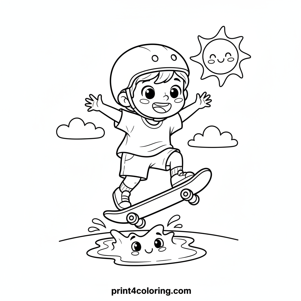 Watch a happy child soar through the air on their skateboard! They've just made an amazing jump over a tiny, friendly puddle, arms wide open in pure excitement. A simple, smiling sun brightens the sky, making this a perfect scene for a fun and cozy coloring adventure. Capture the joy of a perfect leap!