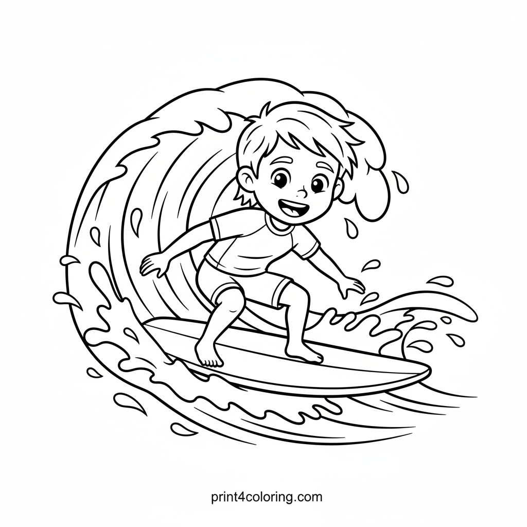Catch a wave of happiness with this coloring page! A cheerful child is expertly balancing on a surfboard, riding the crest of a fun ocean wave. Imagine the cool water splashing around them as they enjoy a perfect day at sea. Grab your crayons and bring this exciting summer scene to life!