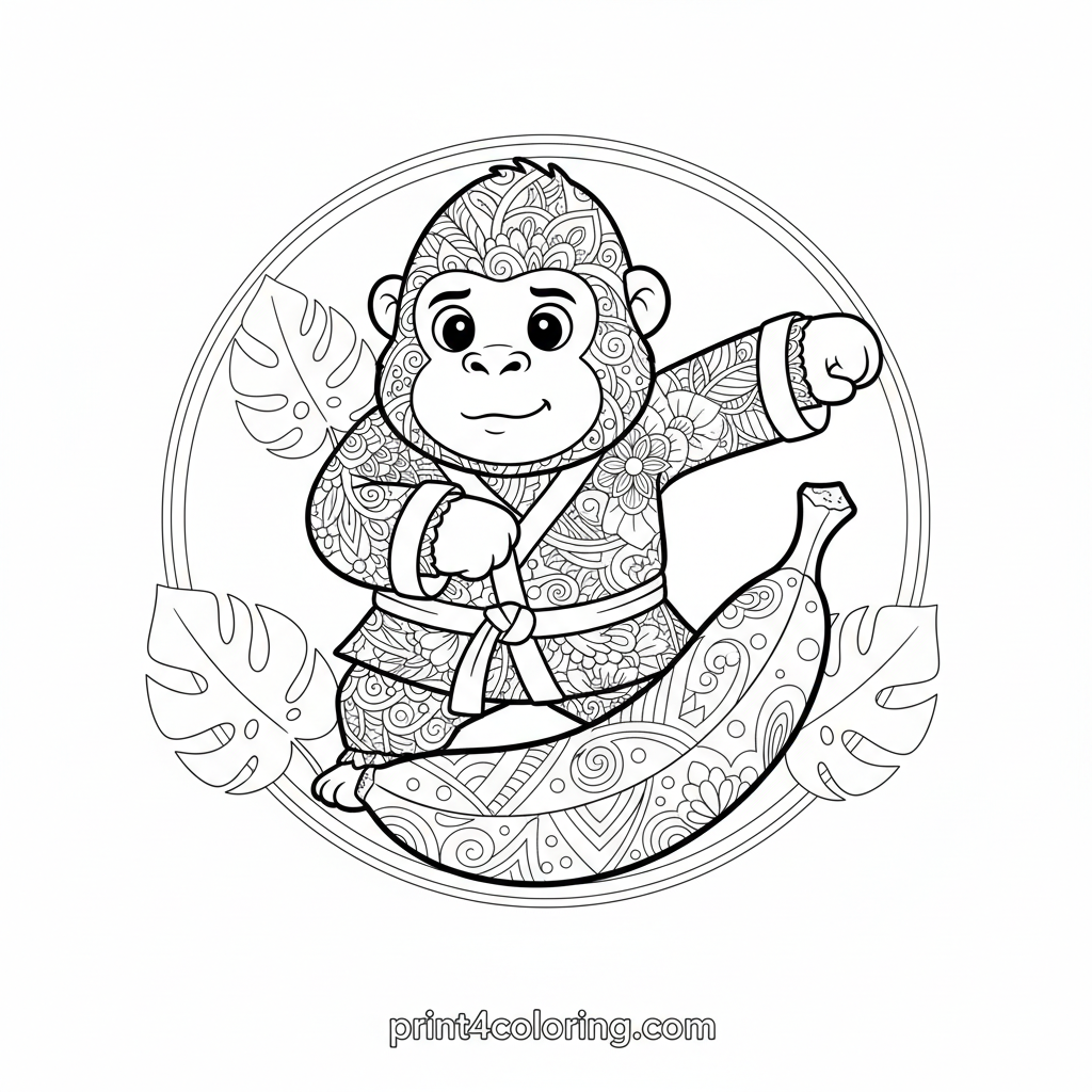 Get ready for a giggle with our mighty gorilla in a full karate gi! He's trying a gentle chop on a giant, ripe banana, but it comically stays perfectly intact. His determined yet bewildered expression and exaggerated pose against playful jungle leaves make for a super funny coloring adventure!