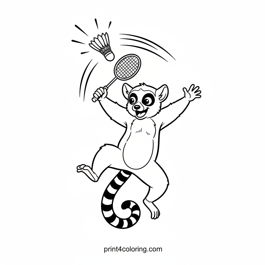 Get ready for a high-flying adventure with our energetic lemur! This page captures a playful lemur mid-leap, racket ready to smash a shuttlecock. With a huge smile and dynamic lines all around, it's a scene bursting with fun and movement. Grab your crayons and bring this action-packed moment to life!