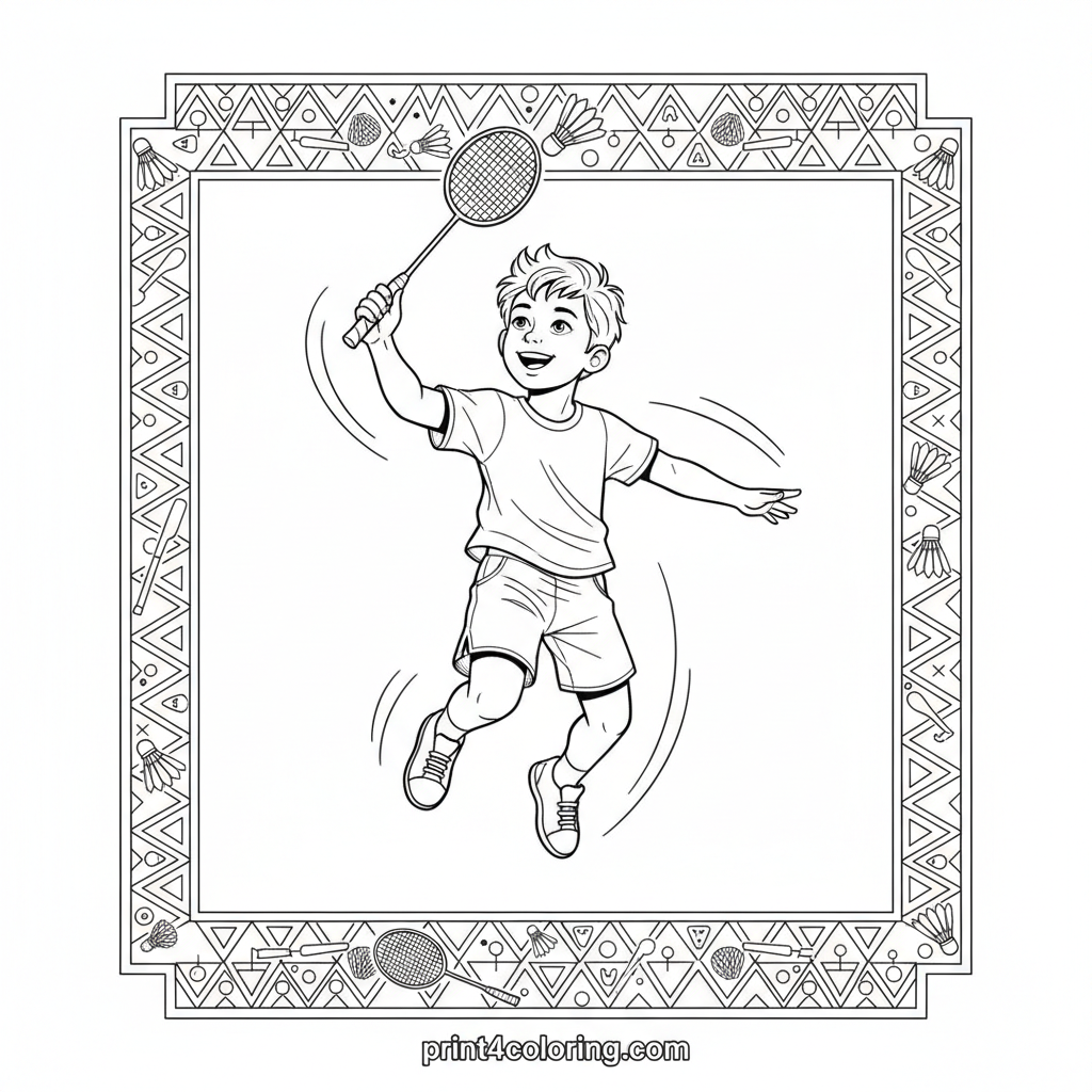 Get ready to color an amazing scene! A friendly, athletic child is caught mid-air, leaping high with a badminton racket poised to perfectly strike a shuttlecock. Intricate motion lines highlight their speed and agility, set against a cool backdrop of stylized geometric court lines. This dynamic page is packed with energy and detail!