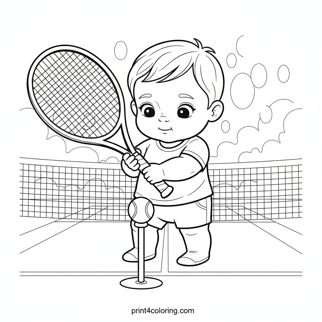 Watch a determined little champion take their first swing! This adorable coloring page features a toddler with an oversized racket, focused on a tennis ball teed up on a sunny court. Capture the joy and concentration of a budding athlete in a cozy, detailed scene.