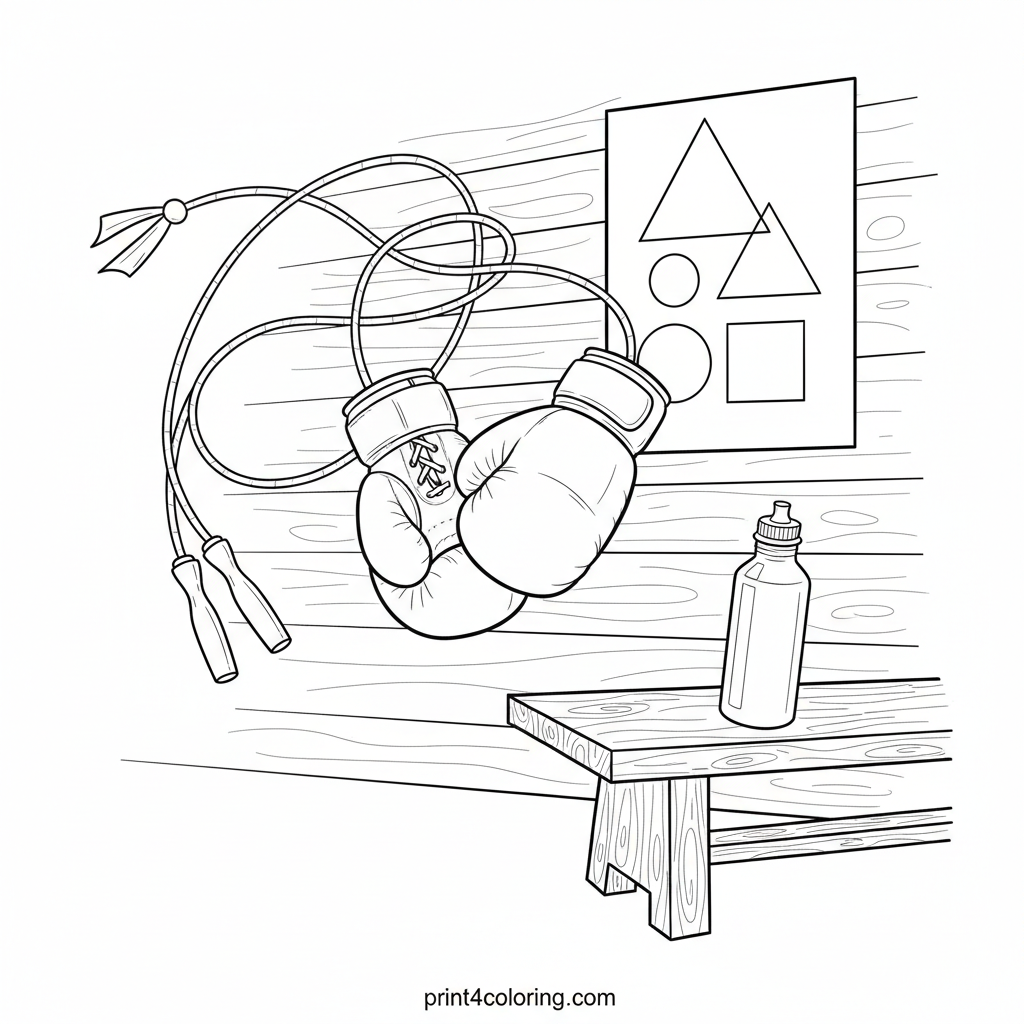 Get ready for a friendly fitness adventure! This detailed page showcases a pair of soft boxing gloves, a neatly coiled jump rope, and a vintage water bottle. Resting on a polished wooden bench with a motivational poster in the background, it's a perfect scene to color while dreaming of active fun and becoming a strong, healthy champion!