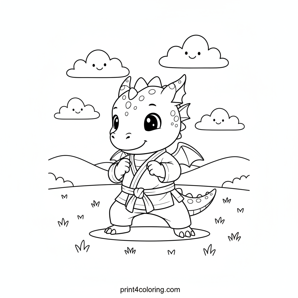 Meet our adorable baby dragon, ready for action! With soft scales and a kind smile, this little martial artist wears a tiny gi and belt, practicing a gentle but powerful guard pose. Color this scene to capture their protective spirit and focused determination as they learn karate.