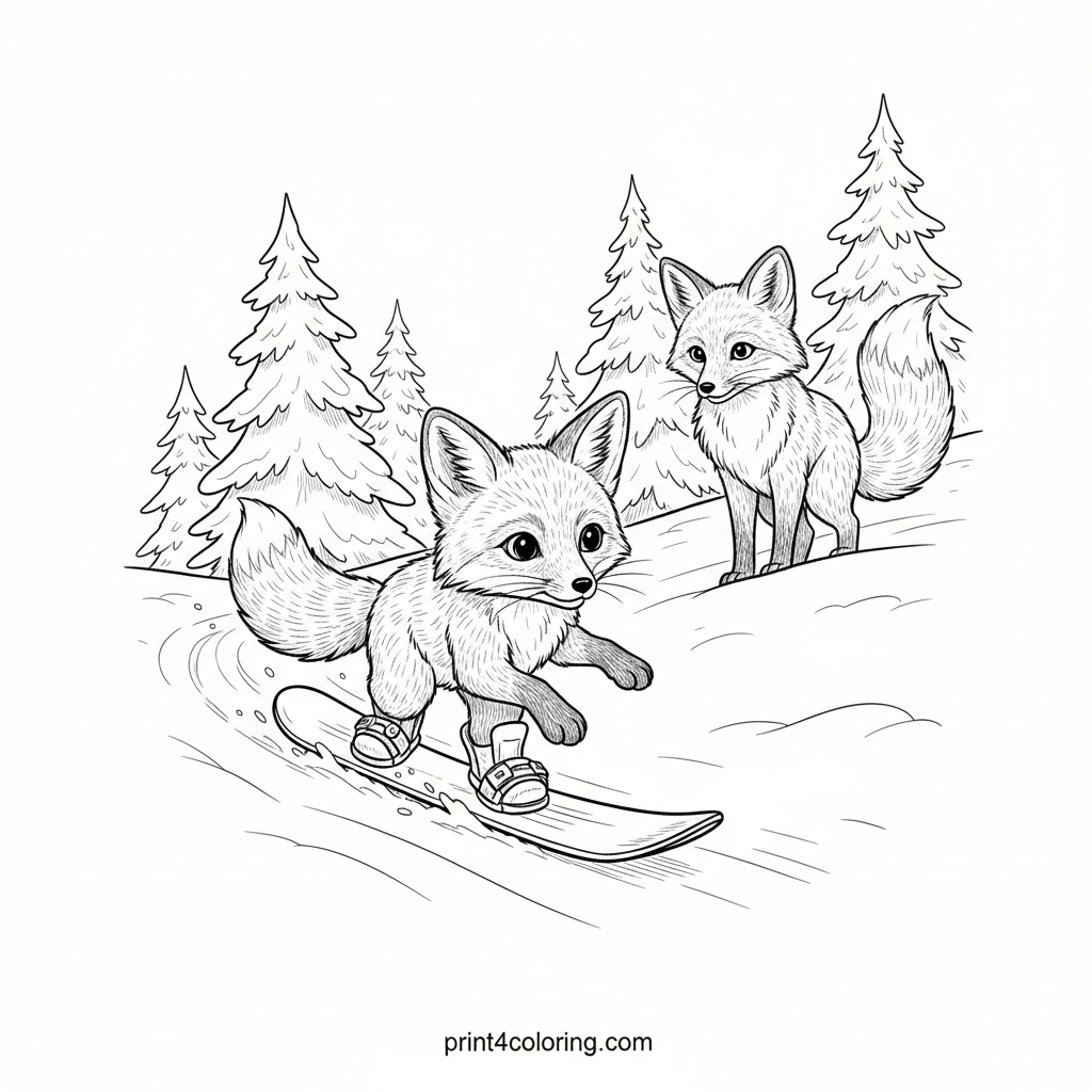 Join a brave little fox as it takes its very first snowboard slide down a gentle, snowy hill! With detailed fur and curious eyes, our foxy friend is carefully balancing, while a watchful parent fox observes nearby. Pine trees dusted with snow complete this heartwarming winter scene, ready for your colorful creativity.