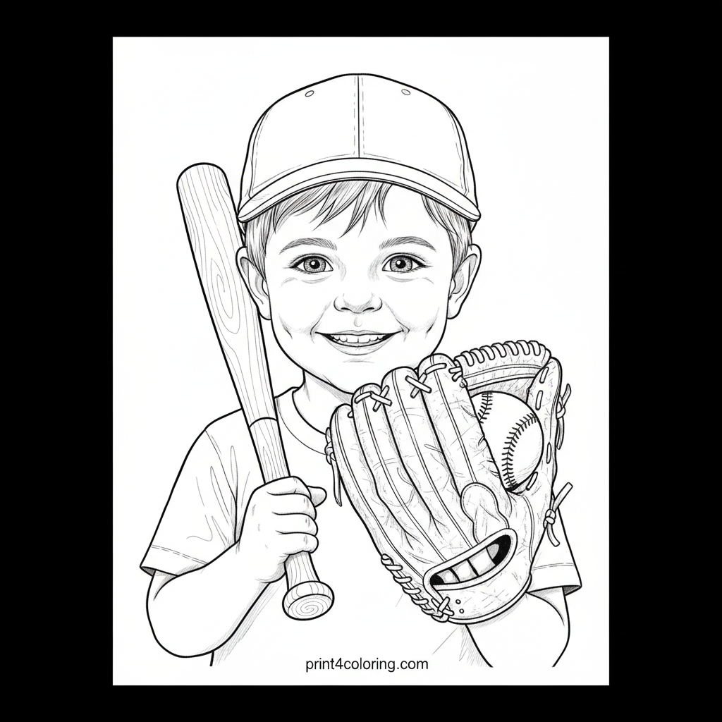 Witness the pure joy of a young child, about 4-5 years old, proudly wearing an oversized baseball glove and holding a slightly too-big bat. Their crooked cap and wide, innocent smile radiate excitement. This detailed portrait highlights the rich textures of the glove's leather, the bat's wood grain, and the ball's stitching, perfect for an expert colorist.