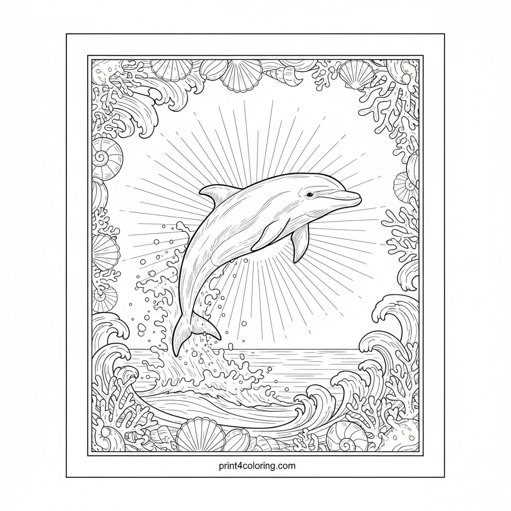 Witness the breathtaking grace of a magnificent dolphin, captured mid-leap against a vibrant sun-kissed sky. Powerful splashes erupt around its sleek body as it arcs high above the ocean's shimmering surface. Add your colors to this joyful, detailed scene, complete with a beautiful pattern frame.