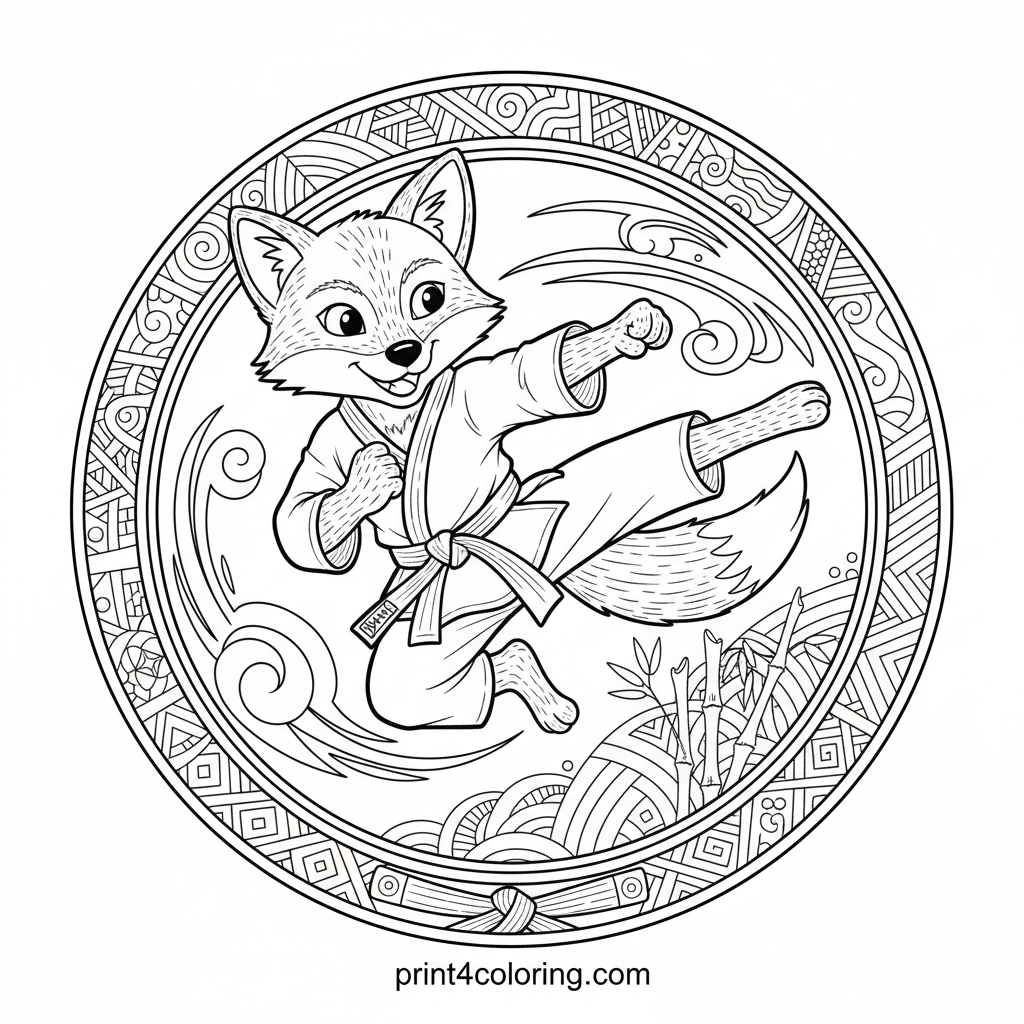 Witness the incredible Leaping Fox Karate Master in action! This detailed page captures an agile fox mid-air, performing a powerful flying kick in a traditional gi. Intricate fur and focused eyes convey determination, while dynamic lines and geometric shapes suggest speed. A challenging scene perfect for advanced colorists!