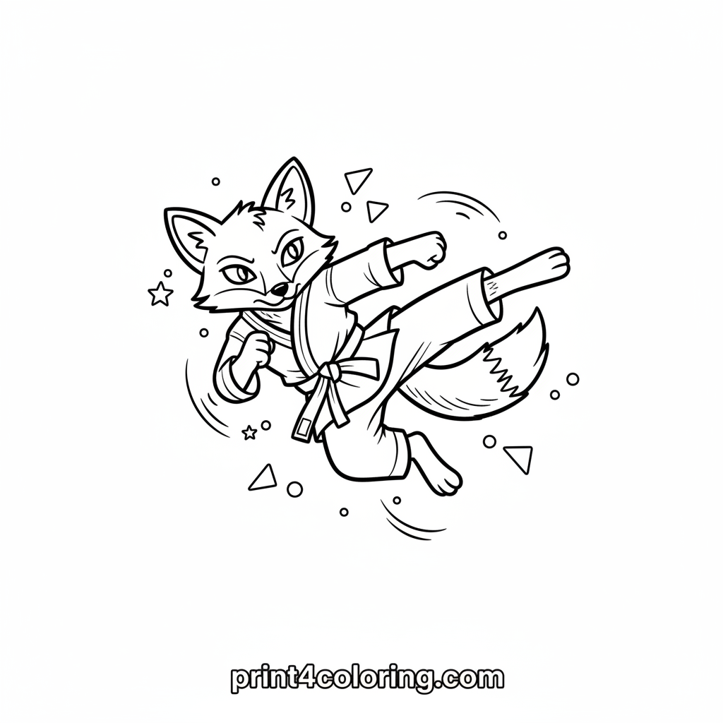 Witness Master Fox in an incredible mid-air karate kick! Dressed in his detailed gi, his focused eyes and intricate fur show determination. Dynamic lines and abstract shapes emphasize his speed and grace. This powerful scene is perfect for bringing to life with your favorite colors.