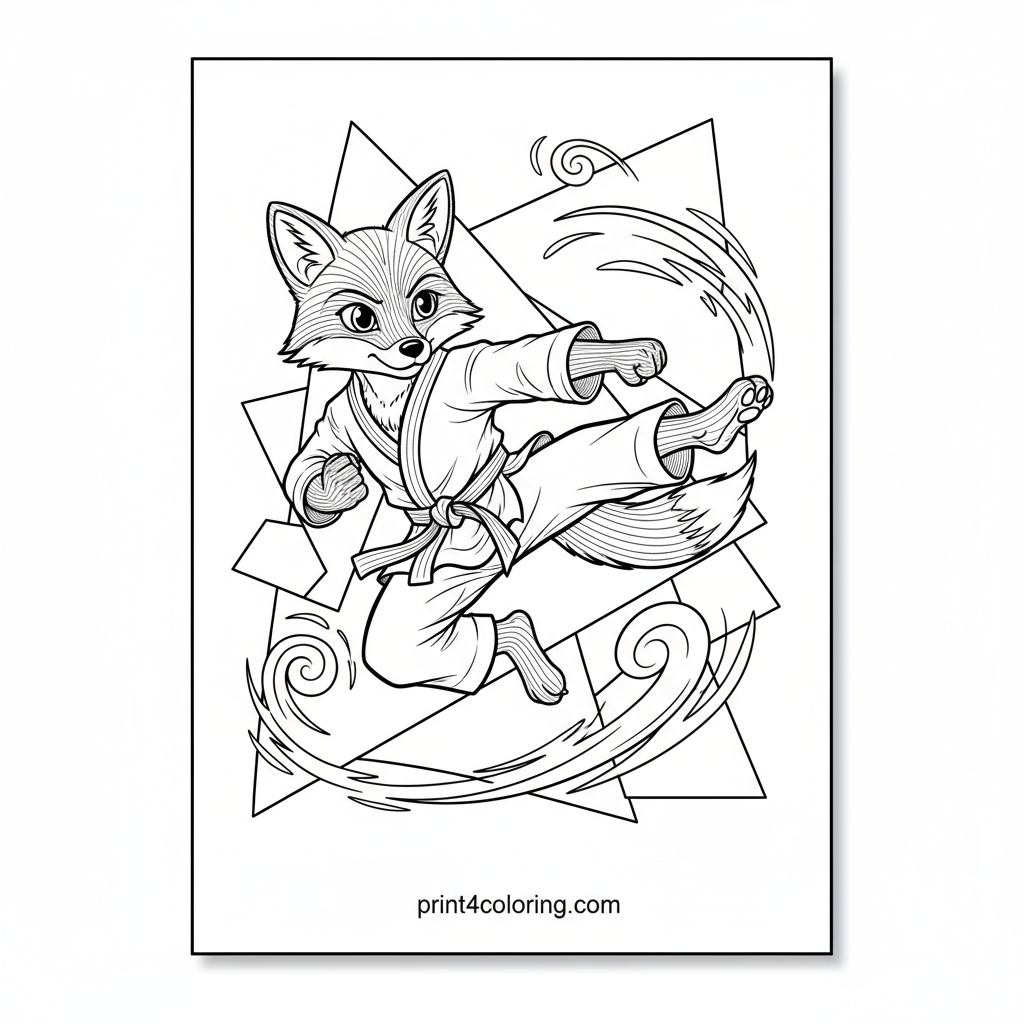 Watch Master Fox as he leaps through the air, performing an incredible flying karate kick! His detailed gi shows his dedication, and his eyes are sharp with focus. The background bursts with abstract shapes, capturing the thrilling speed and power of his martial arts move. A truly dynamic scene for a coloring adventure!