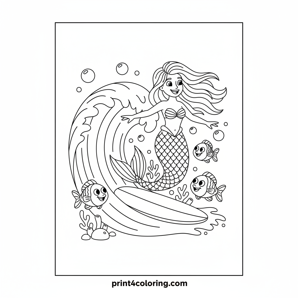Dive into an enchanting underwater world! This coloring page features a graceful mermaid with a shimmering tail, expertly surfing a magical, glowing wave. Smiling fish watch in awe as she glides through vibrant coral and sparkling bubbles. Bring this wondrous ocean scene to life with your favorite colors!