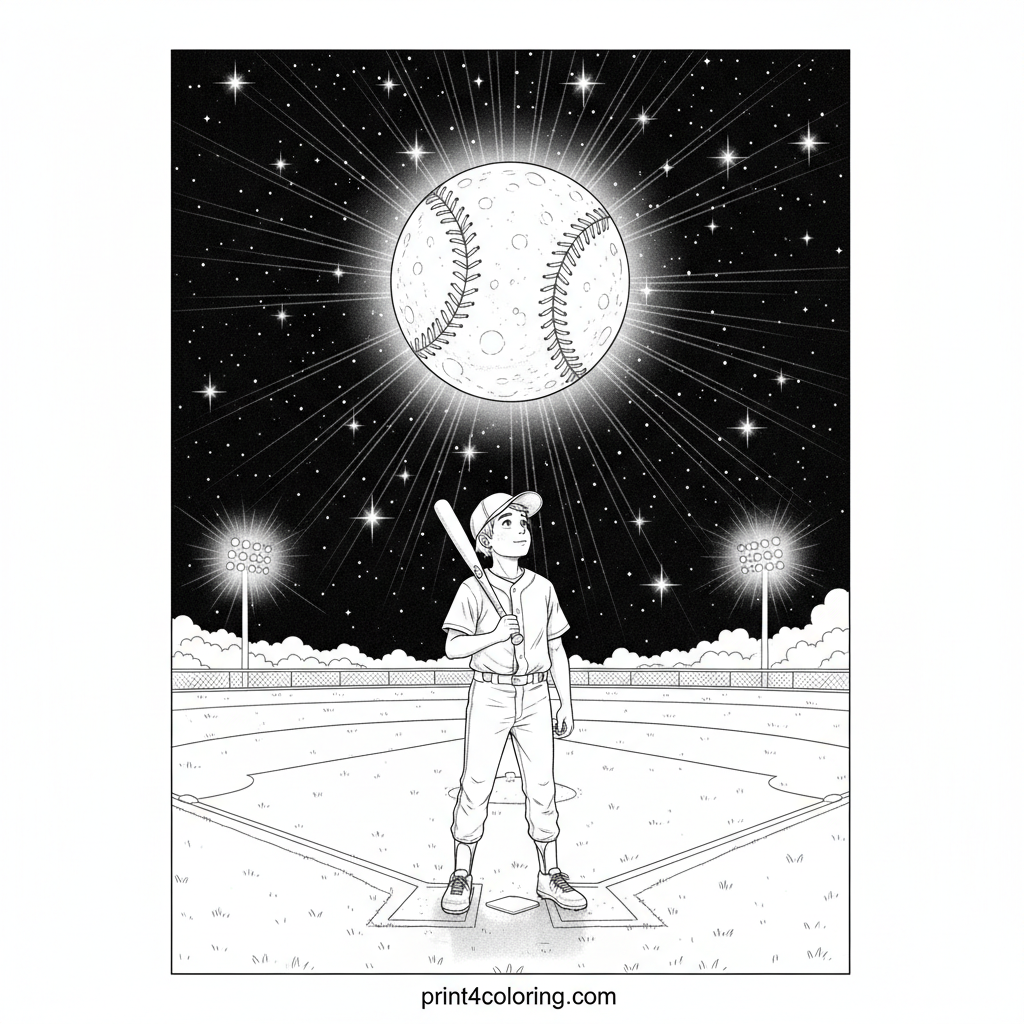 Step onto a magical baseball field bathed in soft moonlight. A lone player stands at home plate, silhouetted against a detailed night sky where a full moon shines like a giant baseball. Twinkling stars and distant glowing stadium lights create a scene of quiet wonder, perfect for bringing to life with your colors.