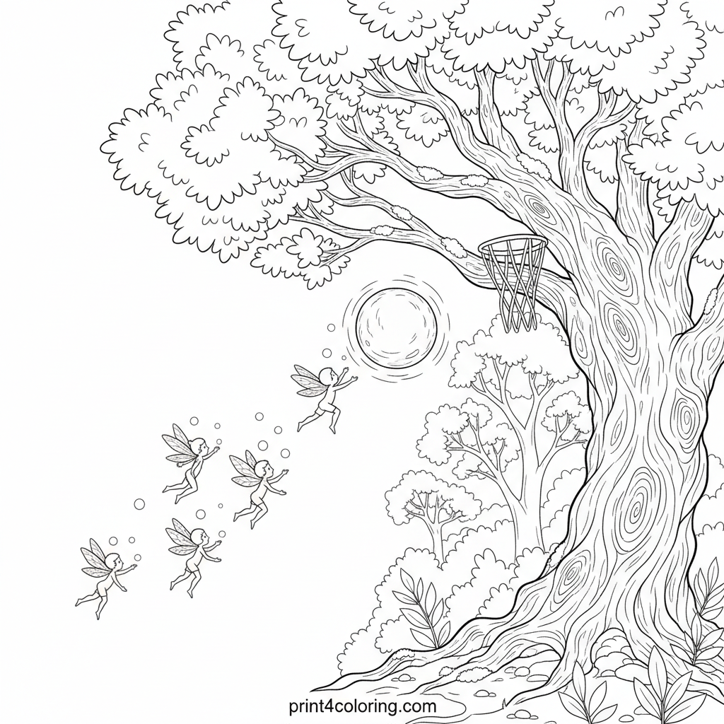 Step into an ancient, magical forest where tiny, glowing sprites are playing their enchanting Moonbeam Ball Game! Delicate, winged sprites guide their luminous moon-ball towards a gnarled oak tree hoop. This detailed scene invites expert colorists to bring the intricate forest textures and ethereal light to vibrant life.