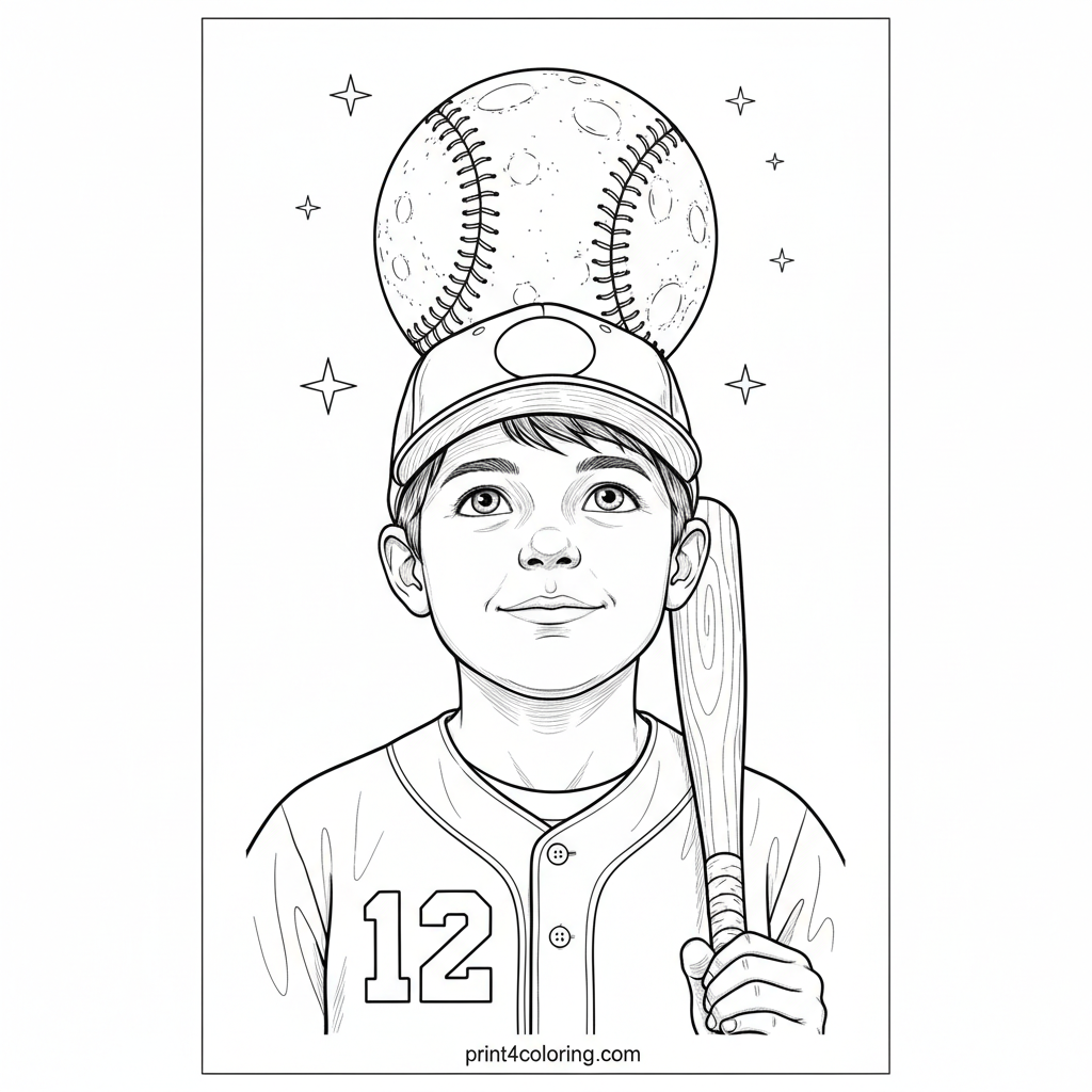 Step onto a quiet baseball field under a magical night sky! A lone player stands at home plate, gazing at a luminous full moon that looks just like a giant baseball. Twinkling stars and softly glowing stadium lights create a serene, dreamlike scene perfect for imaginative coloring.