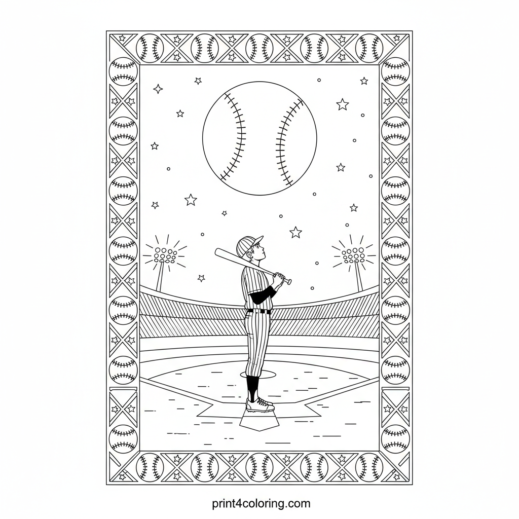 Imagine a magical baseball field under a huge, glowing full moon! A lone player stands at home plate, bat ready, gazing at the moon-ball above. Twinkling stars fill the detailed night sky, and distant stadium lights add a soft glow to this peaceful, dreamy scene. Perfect for expert colorists.