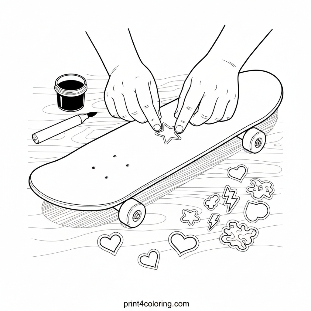 Unleash your inner artist! This detailed coloring page features a child's hands carefully placing a cool sticker onto a skateboard deck. Colorful markers, paints, and other fun stickers are neatly arranged on a wooden surface, ready for your artistic touch. Bring the textures of wood, plastic, and paper to life with vibrant colors.