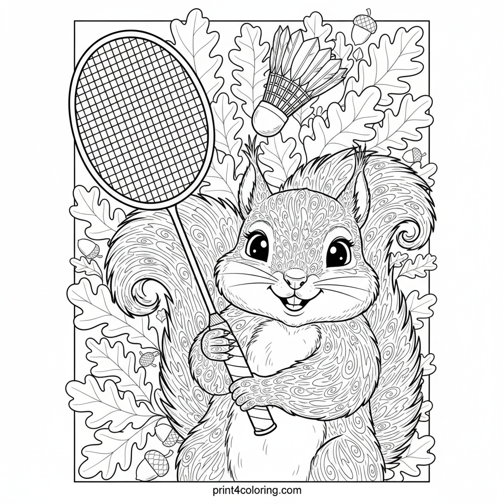 Get ready for an adorable match! This fluffy squirrel, with big, sparkling eyes, is about to unleash its first powerful smash with a giant badminton racket. A shuttlecock hovers playfully, while detailed leaves and acorns add charm to this woodland scene. Perfect for a fun coloring challenge!