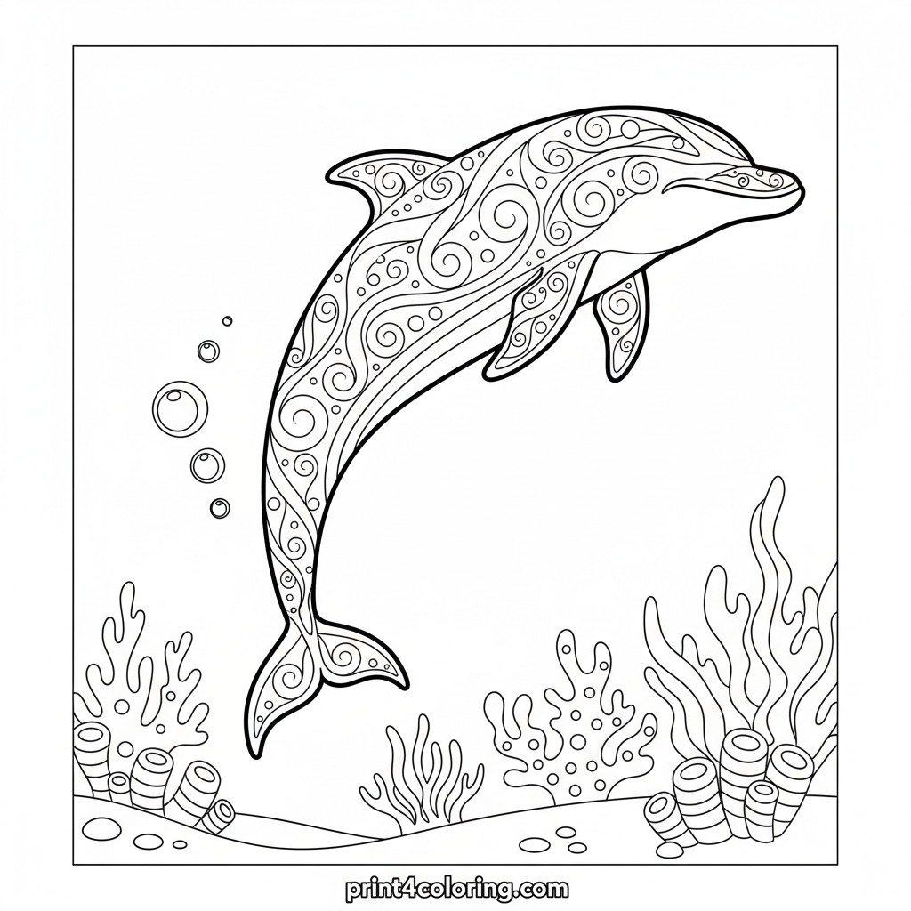 Dive into an underwater adventure! This scene captures a magnificent dolphin in mid-arc, powerfully leaping through sparkling, crystal-clear waters. Watch bubbles trail behind its sleek tail as it glides past intricate coral formations, creating a vibrant ocean masterpiece. Get ready to color a dynamic, detailed aquatic world!