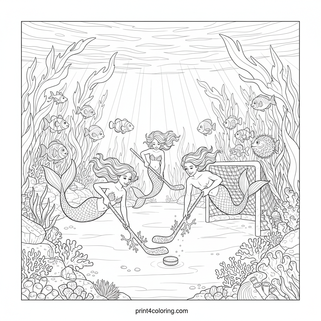 Dive into an amazing underwater world where mermaids and mermen play a thrilling game of hockey! Watch them glide through kelp forests and past colorful coral, using special coral sticks. Friendly fish cheer them on as sunlight dances, creating a magical scene perfect for your artistic touch!