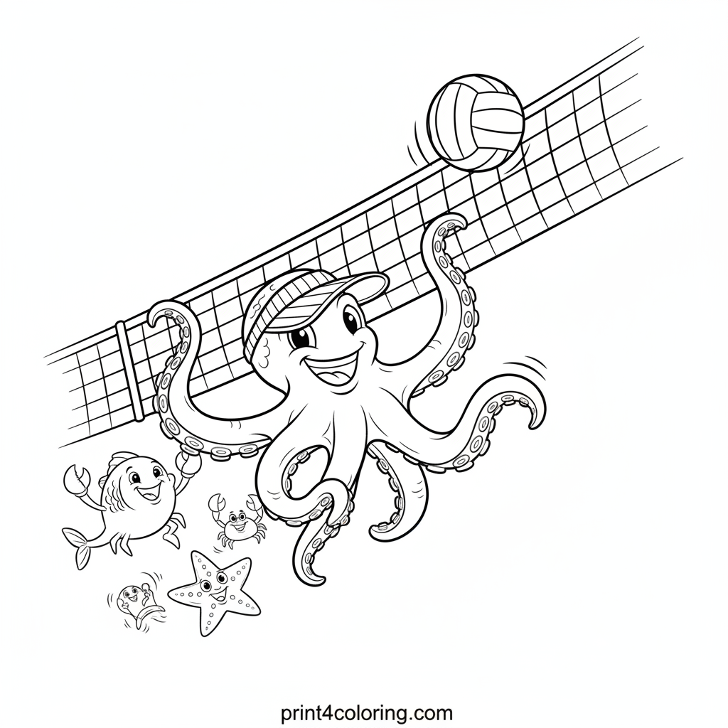Get ready for an ocean-sized giggle! Our silly octopus is a true volleyball superstar, skillfully setting the ball with two arms and spiking it high with two more. Sporting a funny striped visor, it's cheered on by happy sea creature friends. Add vibrant colors to this action-packed underwater game!