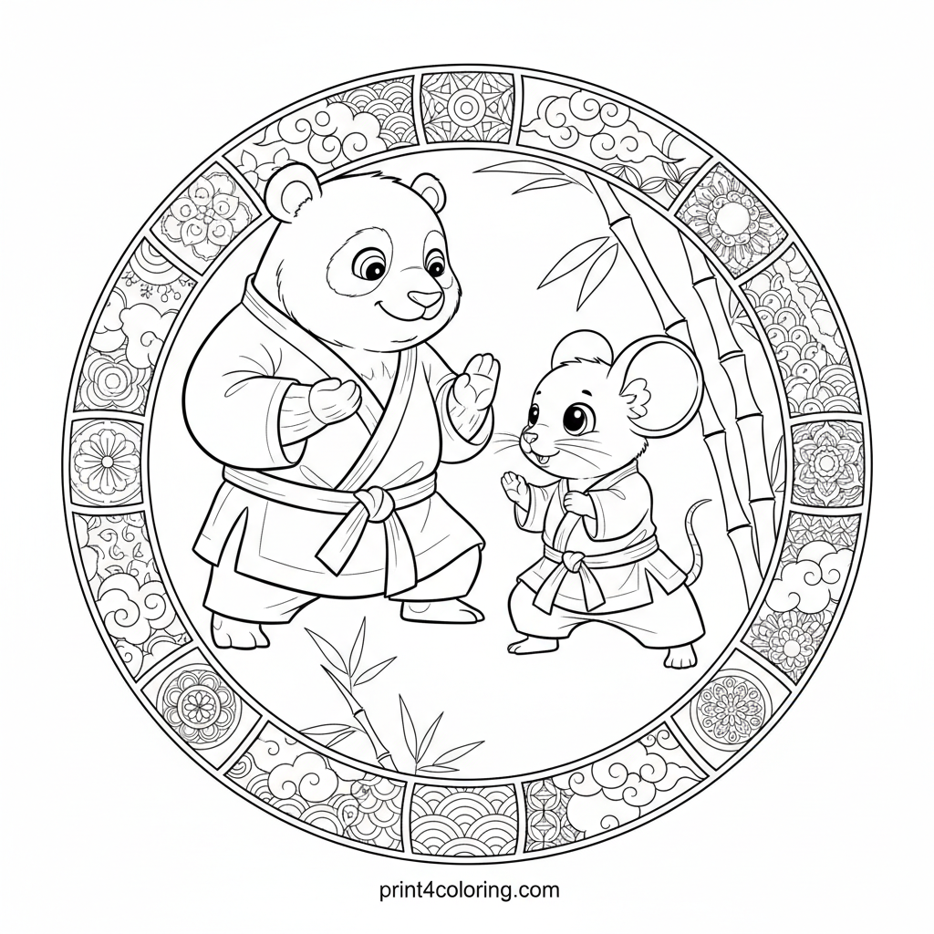Join a wise, smiling Panda Sensei as he gently teaches a tiny, adorable mouse student the very first steps of karate! This heartwarming scene features intricate fur details, large expressive eyes, and a background filled with calming zen patterns and bamboo. A peaceful coloring adventure awaits!