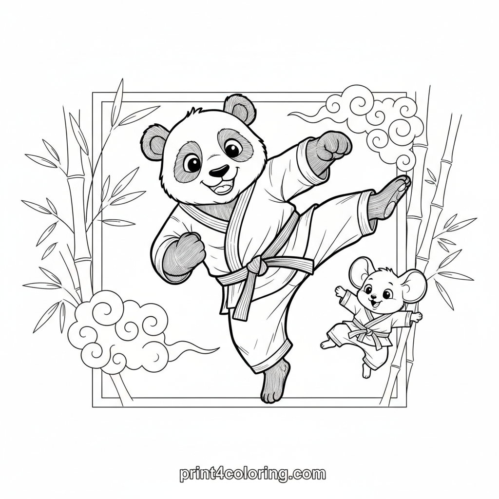 Join wise Panda Sensei as he gently teaches his tiny mouse student the very first karate stance! With big smiles and soft fur, they practice amidst calming bamboo and zen patterns. This intricate scene invites you to add vibrant colors to their inspiring dojo moment, perfect for aspiring martial artists.