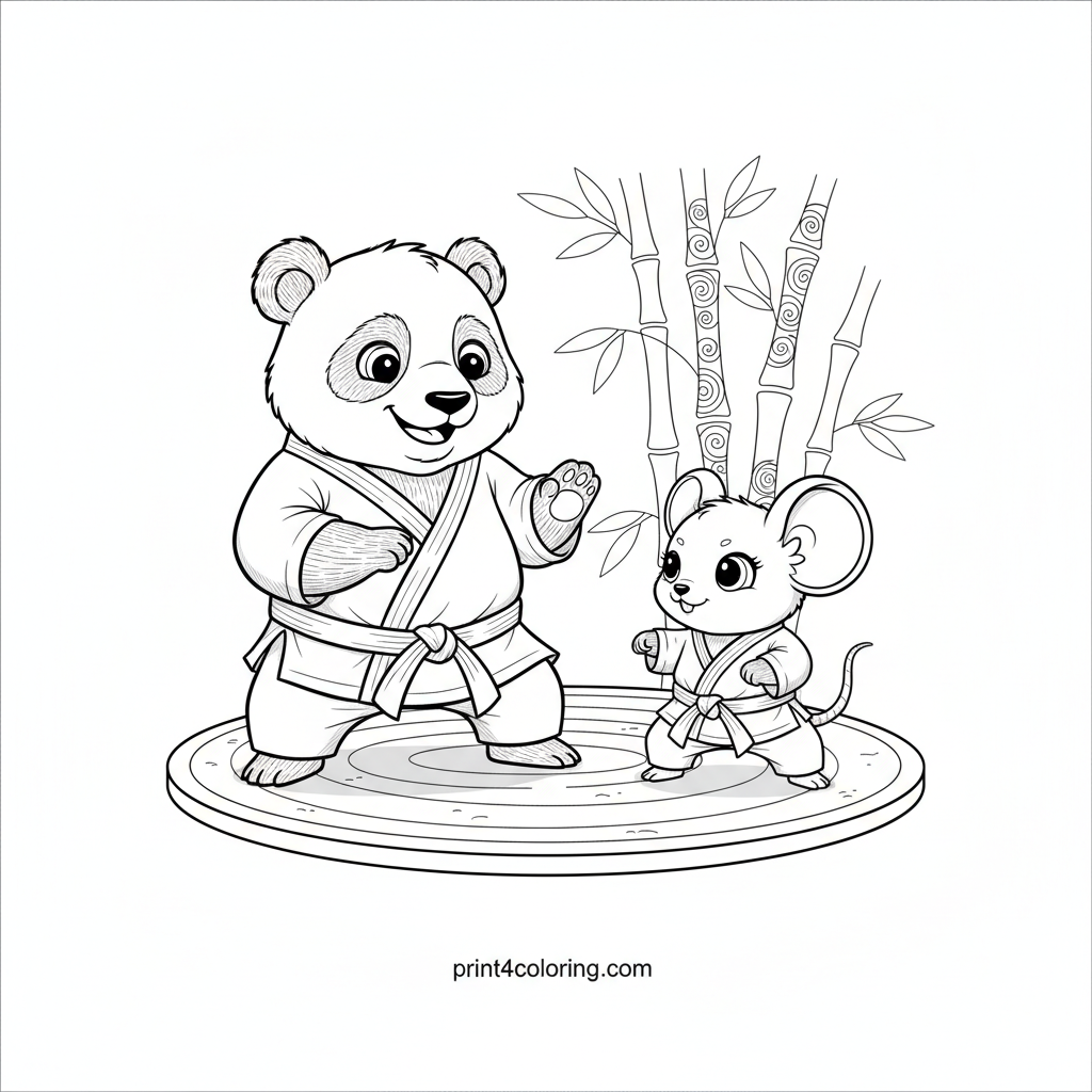 Join the wise Panda Sensei as he shares his first karate lesson! Watch him patiently teach a tiny, adorable mouse student a basic stance in their peaceful dojo. With intricate fur, expressive eyes, and calming bamboo patterns, this scene invites you to add vibrant colors to their inspiring moment of learning and friendship.