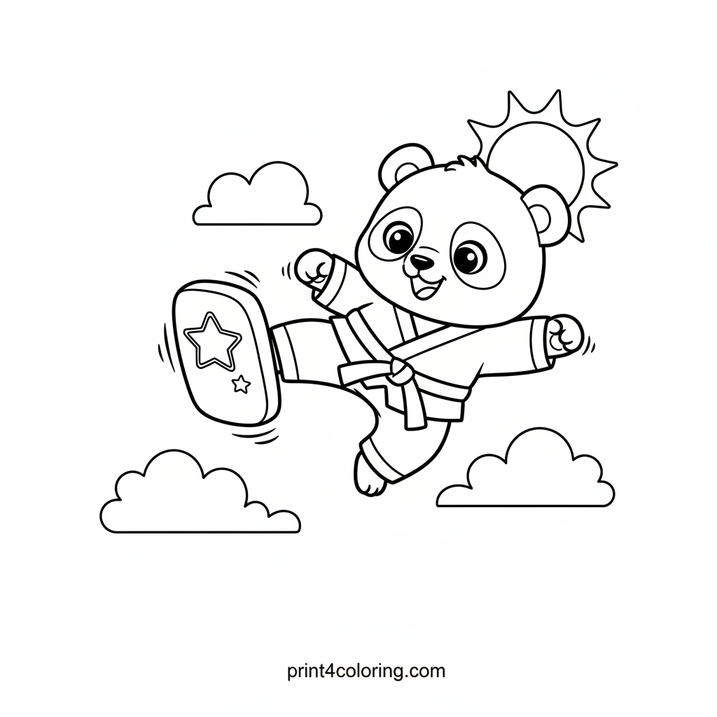 Watch out! This adorable baby panda is ready for action in its tiny taekwondo uniform. With a giggle and big friendly eyes, it's practicing its very first front kick towards a soft toy 'breaking board.' Bring this energetic scene to life with your favorite colors and cheer on our little martial arts master!