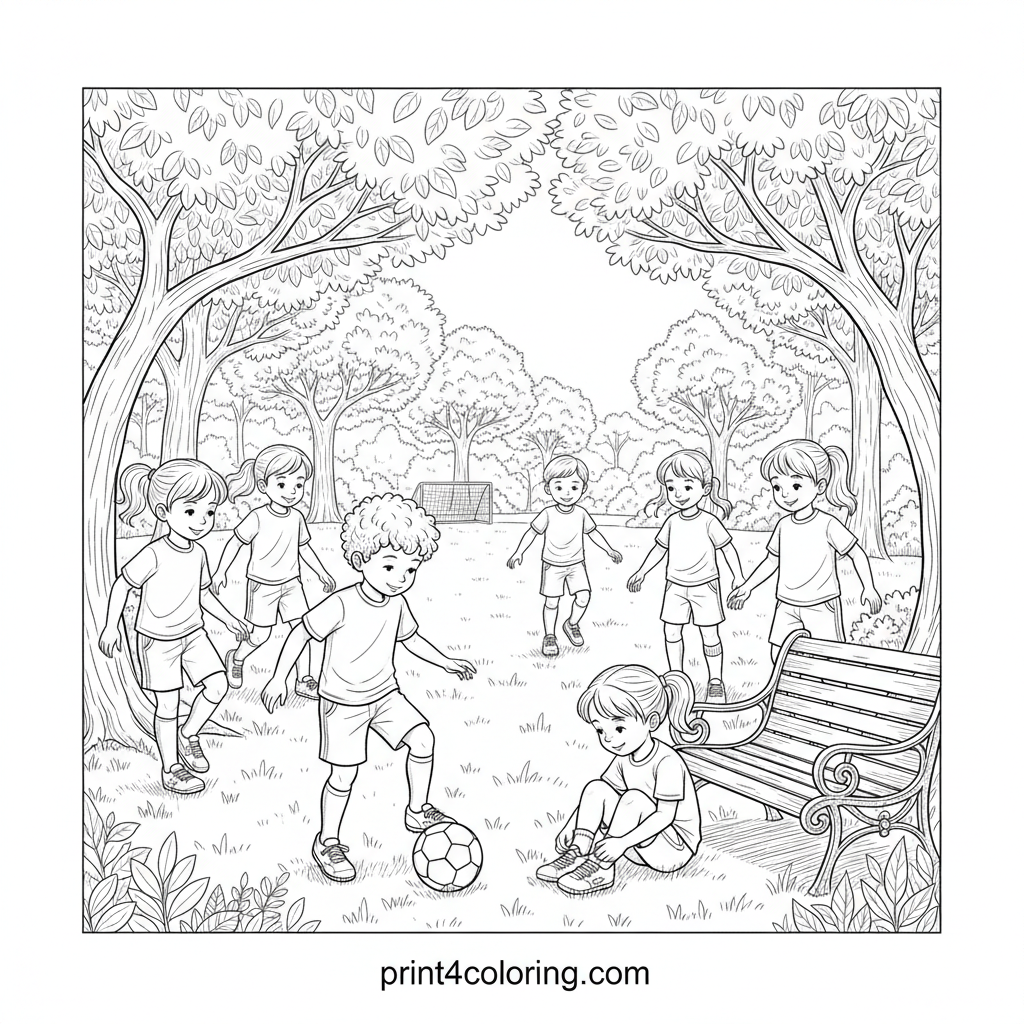Dive into a vibrant scene of a friendly soccer game! A diverse group of children enjoys a sunny day in the park, with one dribbling expertly and another tying a shoelace. Lush trees, a detailed park bench, and a distant goal post create a lively backdrop for this heartwarming outdoor adventure.