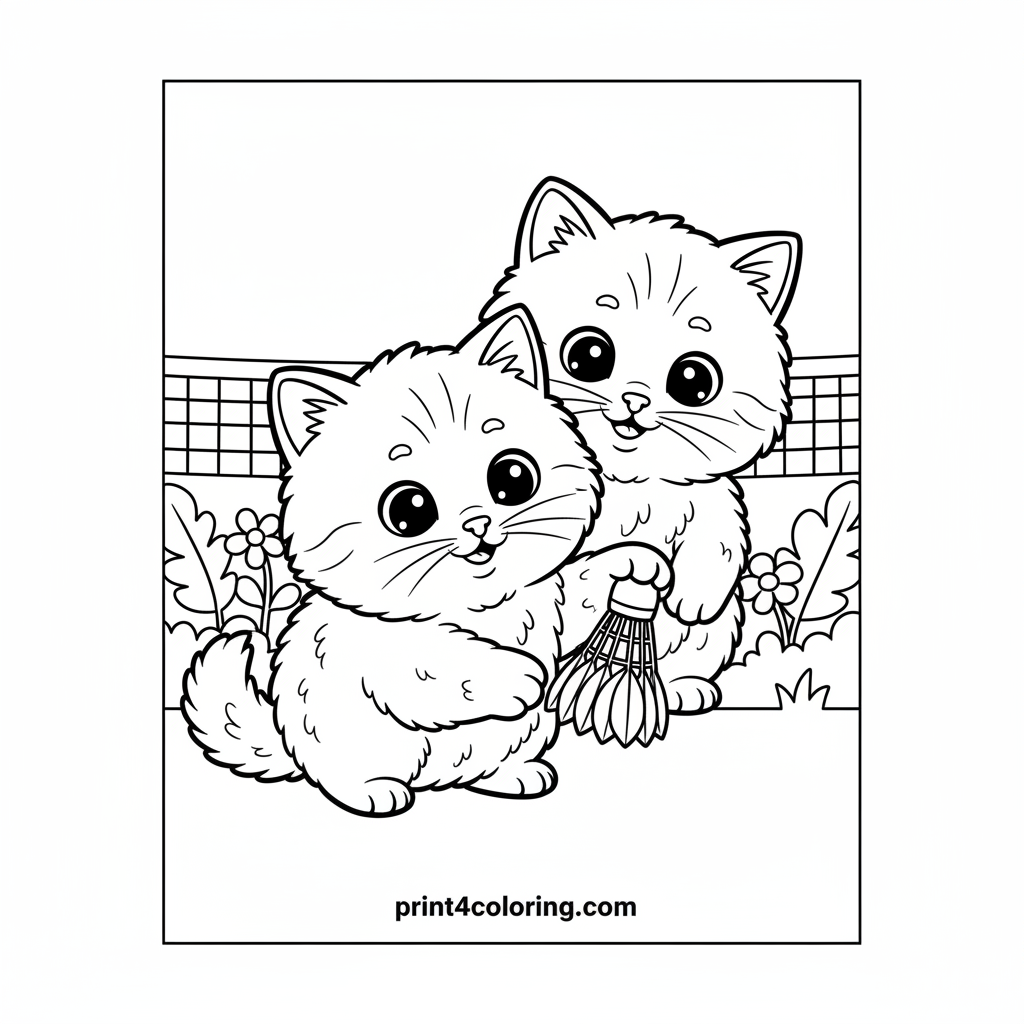 Join two adorable, fluffy kittens as they enjoy a sunny game of badminton in a vibrant garden. Watch one little furball expertly bat the shuttlecock over a low net with its paw. This playful scene is full of warmth and furry fun, perfect for bringing to life with your favorite colors!
