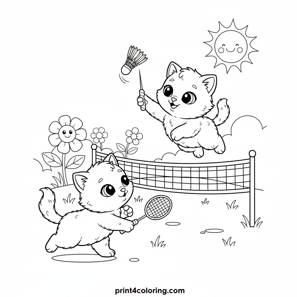 Join two adorable, fluffy kittens as they enjoy a sunny game of badminton in a beautiful garden! With big, friendly eyes, one kitten is caught in an action pose, gently batting a shuttlecock over a low net. This playful scene is purr-fect for coloring and imagining a day of outdoor fun!