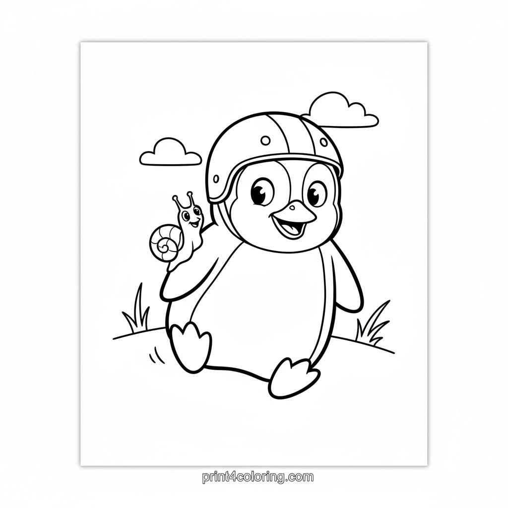 Join a hilarious wobbly penguin, sporting a tiny helmet and a big smile, as it attempts to race a surprisingly speedy snail down a gentle, grassy hill on a skateboard! This funny scene captures the joy of unexpected competition and friendship. Grab your crayons and bring this delightful race to life!