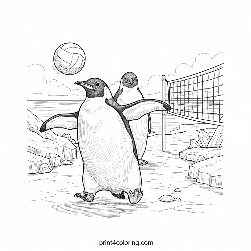 Waddle into a world of fun with this expert-level coloring page! Detailed penguins play a hilarious volleyball game on an icy shore. One comically waddles off-balance, wing outstretched for the ball, while a curious friend watches. Intricate ice formations and a calm sea complete this delightful, action-packed scene for you to color.
