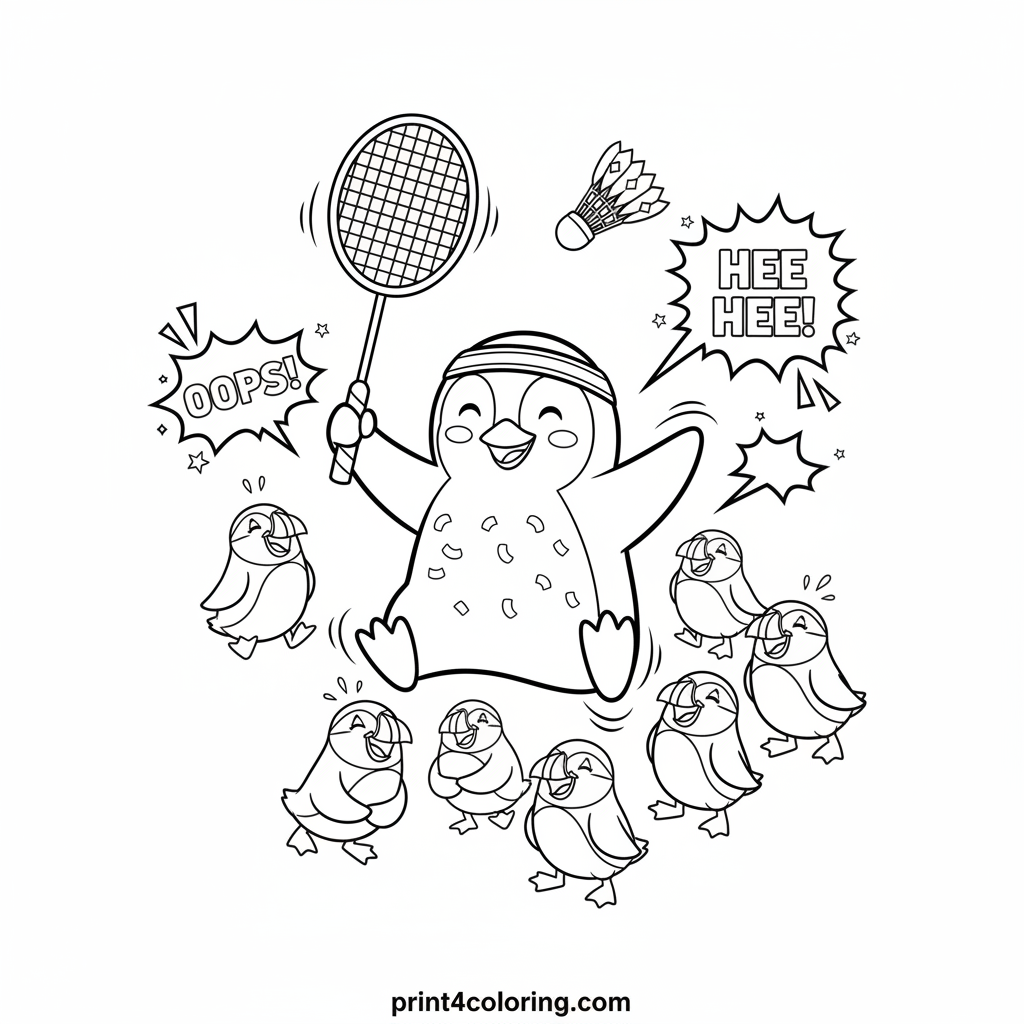 Join a cheerful penguin in a hilarious badminton match! Watch as it comically tries to hit a shuttlecock with its tiny racket, flippers spread wide in a wobbly, action-packed pose. A few giggling puffins cheer on, surrounded by playful 'oops' bubbles, making this a truly funny scene to color!