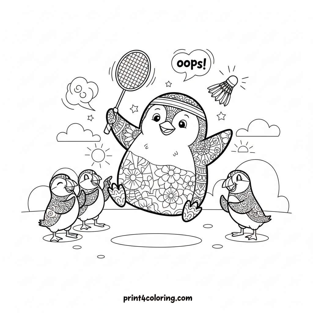Get ready for giggles with this hilarious scene! A cheerful penguin, sporting a tiny headband, comically attempts a wobbly volley with a badminton racket. Its flippers are spread wide in a funny stance. Adorable little puffins watch and giggle, while abstract 'oops' bubbles add to the comical chaos.